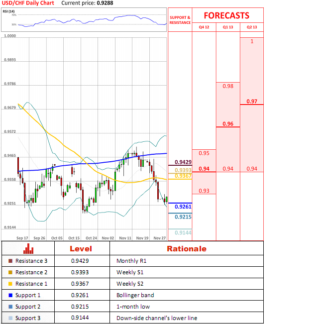 Pair's OutlookUSD/CHF pair slips lower, as yesterday reached 0.9251, the lowest level in one month. The price ignores all signs from technical indicators, which tempts about an oversold zone, as the RSI has value around 30 in both H4 and daily graphs. Current situation demands some correction or a price consolidation in order to continue depreciation process.