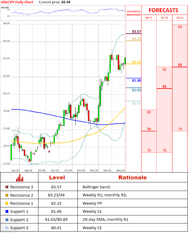 USD/JPY pair found a support for a further appreciation and the price stepped higher from the weekly PP at 82.16. Currently, the price moves towards a previous high at 82.83, which is the highest point in 8 months. As the pair maintains strong bullish sentiments, but technical indicators tempt about an oversold situation, therefore, a sharp increase above the previous high would not be very likely.
