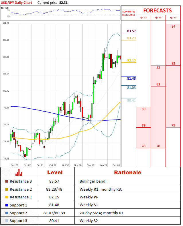 USD/JPY pair slips lower after an unsuccessful attempt to breach a previous high at 82.84. Currently, the price is close to the weekly PP level at 82.30. There depreciation of the U.S. Dollar seems to be a likely scenario, as in a weekly graph the pair is testing the Bollinger line form above and the RSI indicators has a value 65 in a daily and weekly time frames.