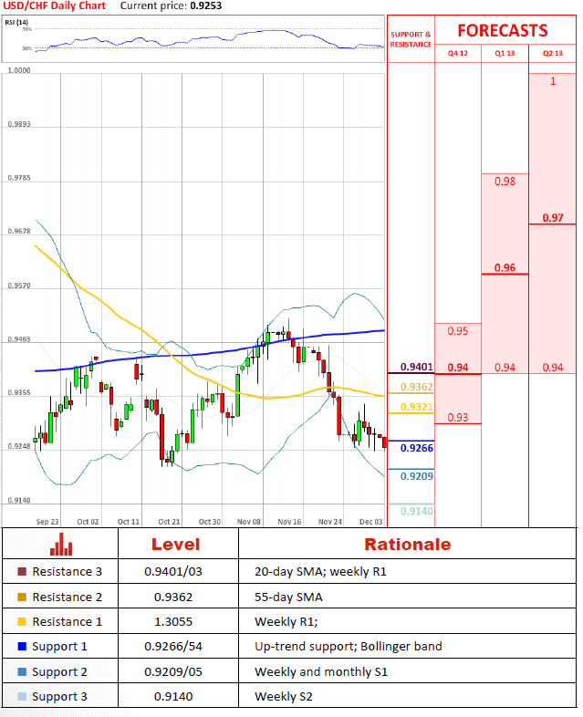 USD/CHF pair started a new week with a decrease just from the uptrend line at 0.9275. If a daily candle closes beneath the open price and settles under the upside line, there is vey possible to see a price depreciation to 0.9190/80 area, where the weekly S2, monthly S1 and the lower line of Bollinger line intersect.