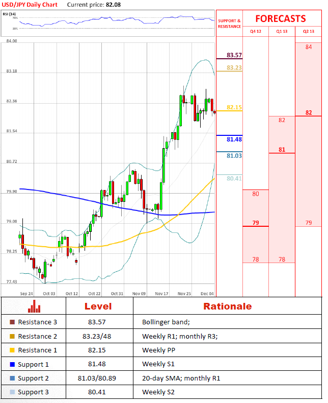 After USD/JPY pair found a resistance at 82.47, the price moves south. As the pair is overbought to a significant extent, possibility of a deeper correction is increased. The first support level will be the weekly S1 at 81.86 and after that—81.46 area, where the monthly PP level crosses with the 20-day SMA.