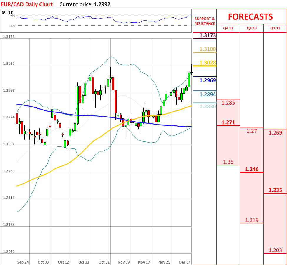OutlookToday EUR/CAD experienced another slight bullish advance, and now the price is slowly approaching the upper Bollinger band at 1.3028, which is expected to reverse the prevailing movement upwards. In case it it breached, then the currency couple might reach the weekly R3 at 1.3100, which in turn will probably slow down the current rally. Additionally, the overall indicator outlook is positive, therefore supporting the prevailing bullish tendency.