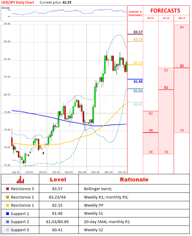 "We took action in September and October because what we thought were risks back in the summer materialized. We must debate and consider whether that was enough, taking into account various data which came out since then" - Kiyohiko Nishimura, The Bank of Japan (based on Reuters)Pair's OutlookLast few days losses in USD/JPY pair are almost erased, as the pair surged tonight from the lower Bollinger band and is currently retesting the weekly PP at 82.30. The price has not broken neither the last high nor the last low, so it is possible to see a symmetrical triangle and trade from its boundaries.