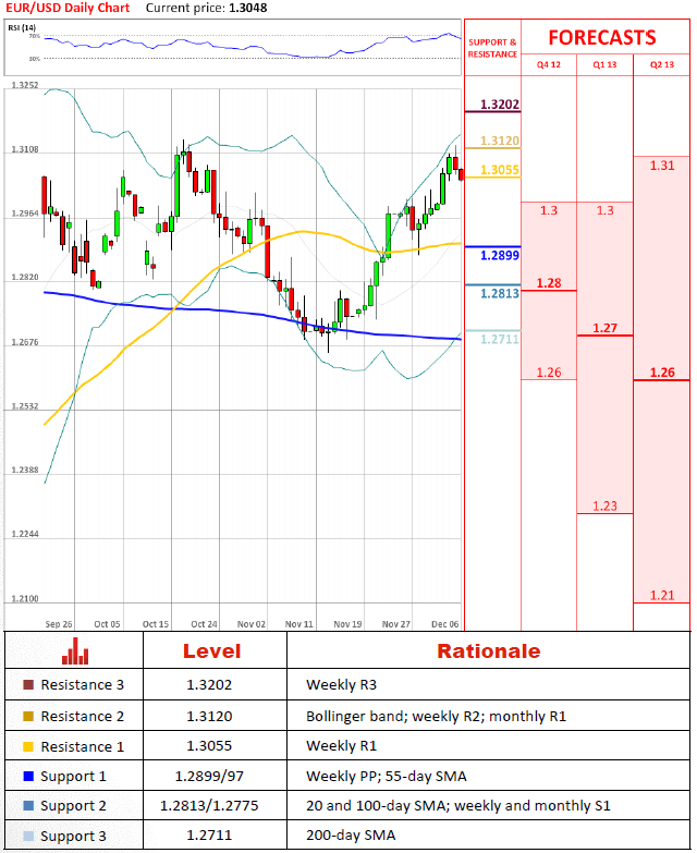 EUR/USD slips for a second trading session, as a 1.3115/21 resistance level (the weekly R2 and monthly R1) proved to be strong enough to stop a price's appreciation. Currently, the currency pair is testing the weekly R1 at 1.3055 and, if this resistance does not cause too much trouble, the price might reach a 1.2907/1.2891 area, where the monthly PP and weekly S1 intersect with the 100-day SMA.