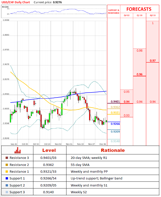 Pair's OutlookSituation in USD/CHF pair does not change, as the price remains in a narrow range below the up-trend line at 0.9279. If the currency pair moves north, it is likely to see it around a 0.9327/46 area, where the monthly PP and weekly R1 merge with the 55-day SMA. Provided that the price continues its depreciation, the key support will be a 0.9190/80 area, where the weekly S2 and monthly S1 intersect with the lower Bollinger band.