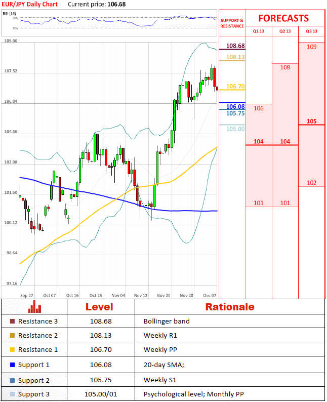 Pair continued its yesterdays dip, but was halted and kicked back up by 20-bar SMA at 106.08. However, weekly PP at 106.70 did not allow the pair to pick up any higher. Technical indicators send a very strong aggregate buy signal, suggesting that mentioned SMA might kick in some momentum in to pair and we could see additional attempt to reach new high early next week.