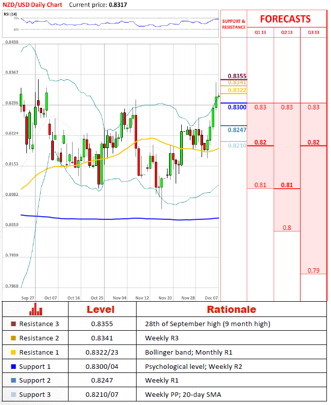 9 month high at 0.8355 seemed within the reach, but combined pressure coming form it and weekly R3 at 0.8341 made the pair to contract 33 pips before the close. Pair demonstrates rather positive, however much more modest, results today as well—at the moment it is testing strength of Bollinger band/monthly (R1) at 0.8322/23. Although, technical indicators point at appreciation of the pair Stochastic indicator is in overbought zone and %K and %D are almost crossing.