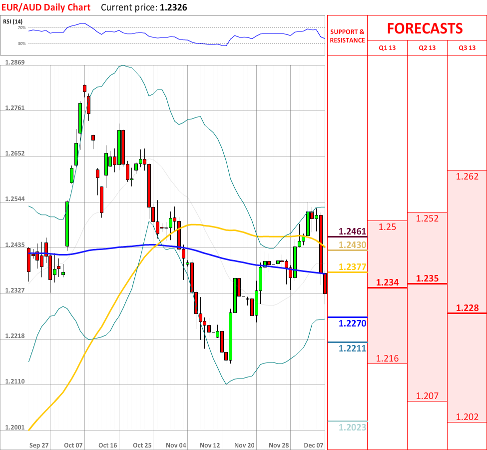 OutlookToday the EUR/AUD currency couple experienced another consequent movement downwards, which has already managed to breach the 200-day SMA at 1.2377, and now the price is gradually heading towards the lower Bollinger band at 1.2270, which is expected to reverse the prevailing tendency. In case it is broken, then the currency pair is likely to reach the weekly S3 at 1.2211, which in turn will probably bring some bullish impulse. Moreover, the overall indicator outlook is neutral, therefore no significant trend reversals are expected in the nearest future.