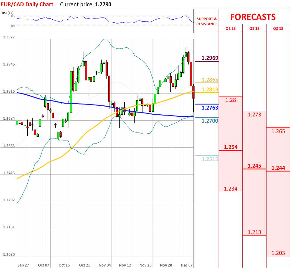 OutlookThe bearish trend, which started a couple of days ago, has successfully managed to continue, as today the EUR/CAD currency pair experienced another bearish reaction, which has already managed to breach the 55-day SMA at 1.2818, and now the currency couple is about to test the weekly S2 at 1.2763, which might slow down the downtrend, but if it fails to stop the bearish movement, then the price will probably reach the 200-day SMA at 1.2700, which in turn is expected to change the direction of the prevailing downtrend. Nevertheless, the overall indicator outlook is bullish, therefore supporting the potential trend reversal in the nearest future.