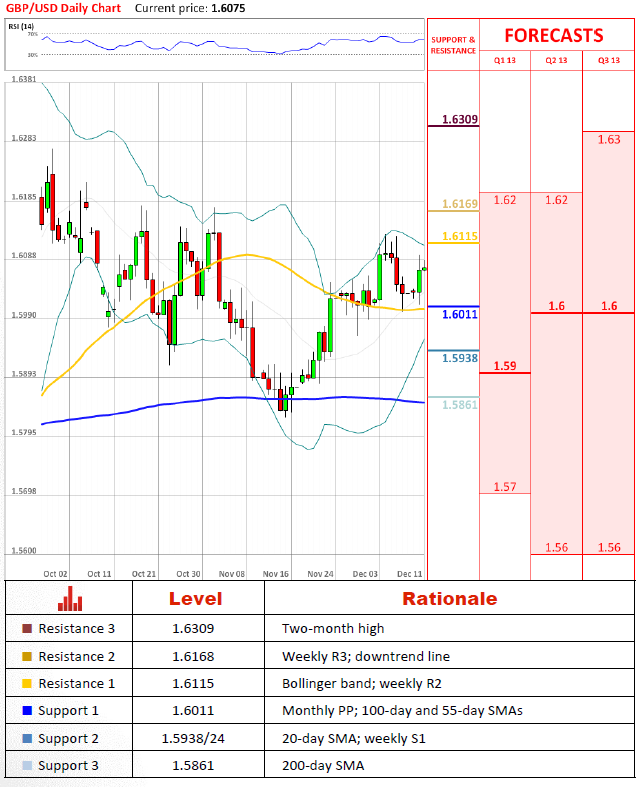 - Bank of Tokyo-Mitsubishi (based on Reuters)Pair's OutlookGBP/USD pair was slipping downward yesterday morning, but in London trading session the price reversed its direction and presently is firmly moving higher. The price still remains above the 20-day SMA, being is a strong signal of an up-trend. Therefore possible resistance levels are at 1.6109, where the R1 lies, and at 1.6132, an upper line of the Bollinger band.