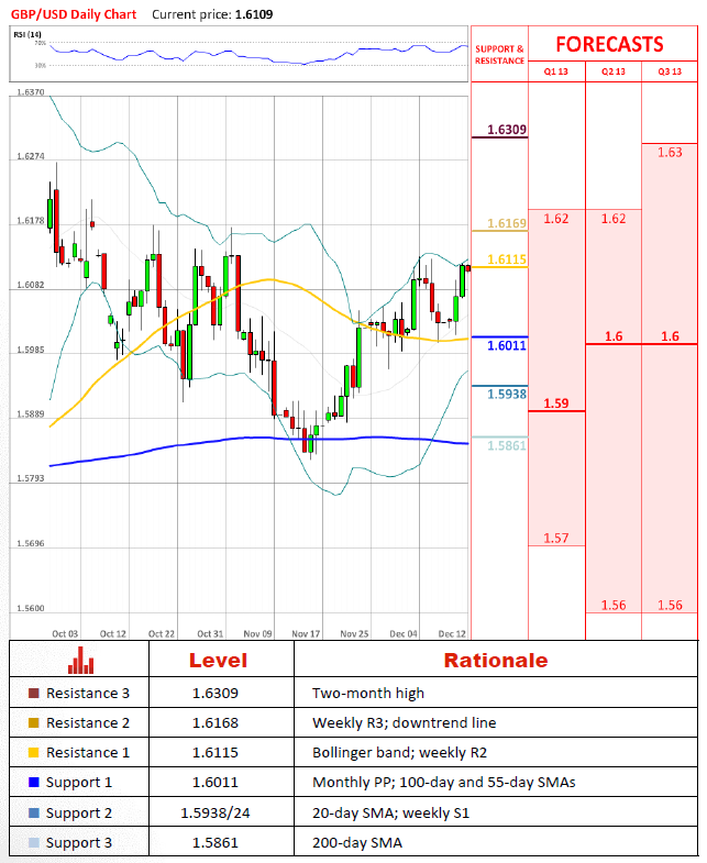 Pair's OutlookGBP/USD pair's appreciation was stopped by the weekly R1 level at 1.6109. Currently, the price consolidates and it is very likely to see a further increase, at least till 1.6139, the upper Bollinger band. In case the impulse is strong enough to move higher, then the next resistance is at 1.6184, where the R1 intersects with R2.