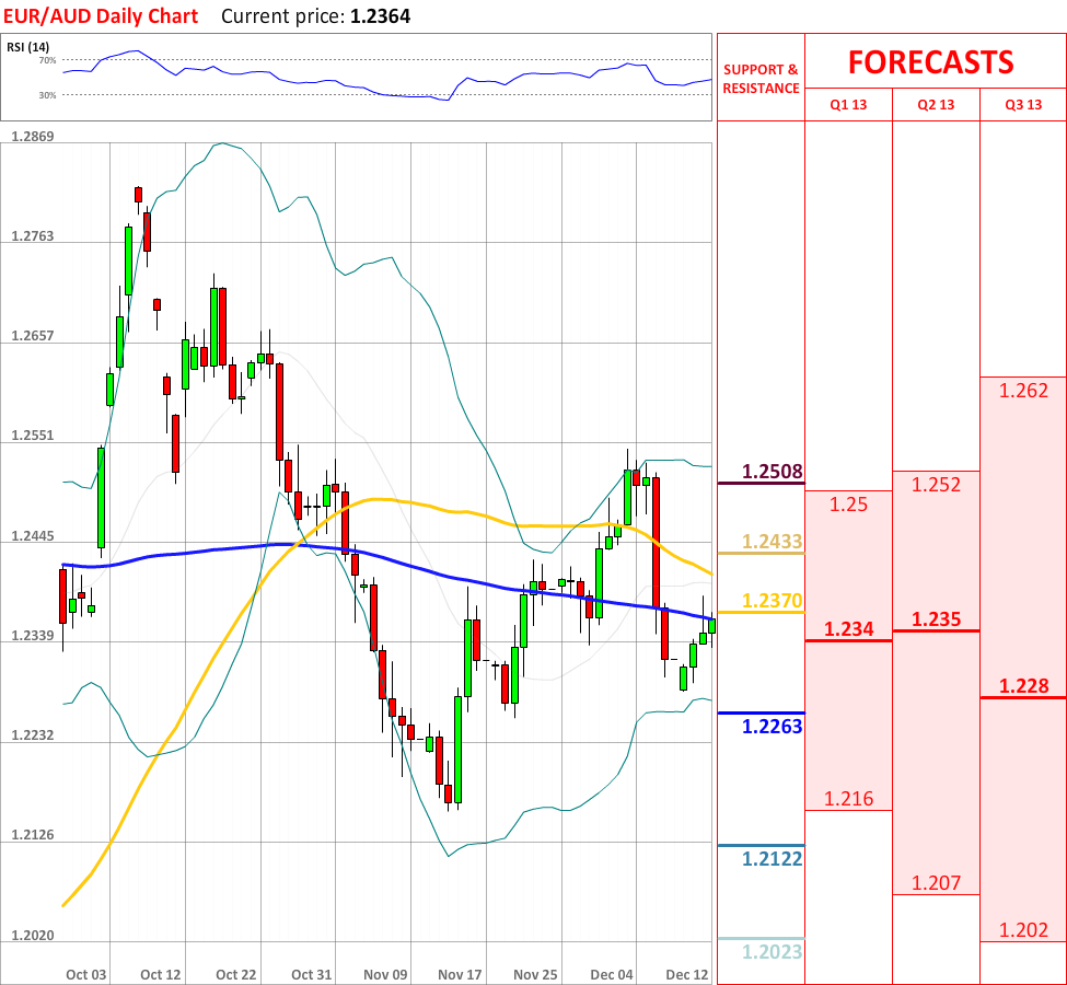 OutlookThe bullish tendency, which started a couple of days ago, has successfully managed to continue, as today the EUR/AUD currency couple experienced another consequent movement upwards, and at the particular moment the price confronts the 200-day SMA at 1.2370, which is expected to reverse the prevailing bullish trend, however, if it is breached, then the currency pair might reach the 55-day SMA at 1.2433, which in turn is very likely to bring some bearish impetus. Moreover, the overall indicator outlook is neutral, therefore no significant tendency changes are expected in the upcoming days.