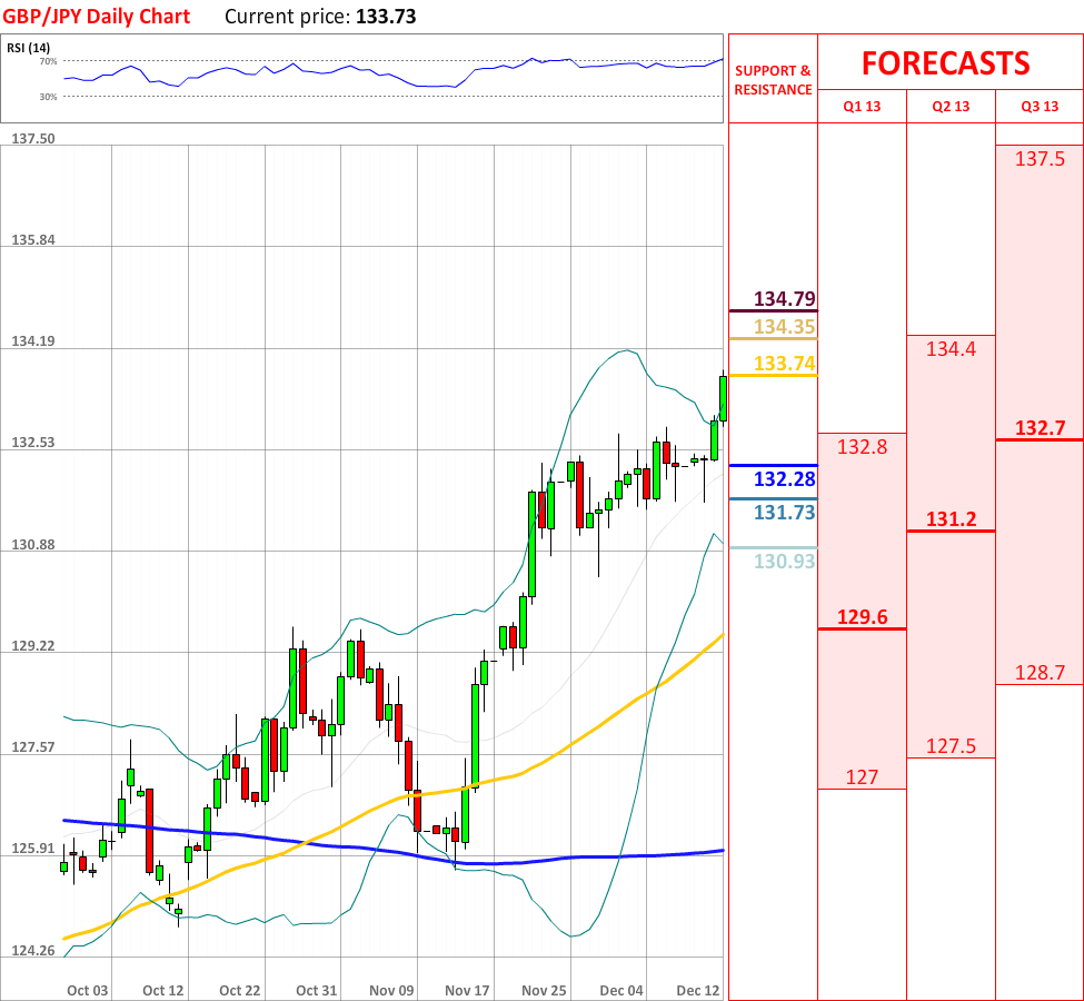 OutlookGBP/JPY successfully managed to keep its bullish outlook, since today the currency couple experienced another significant bullish advance, which managed to break =the upper Bollinger band, and now the currency pair is about to test the weekly R2 at 133.74, which will probably bring some bearish momentum, but in case it fails to slow down the movement upwards, then the price might reach the weekly R3 at 134.35, which in turn is expected to change the prevailing tendency. In addition, the overall indicator outlook is positive, therefore supporting the current bullish trend.