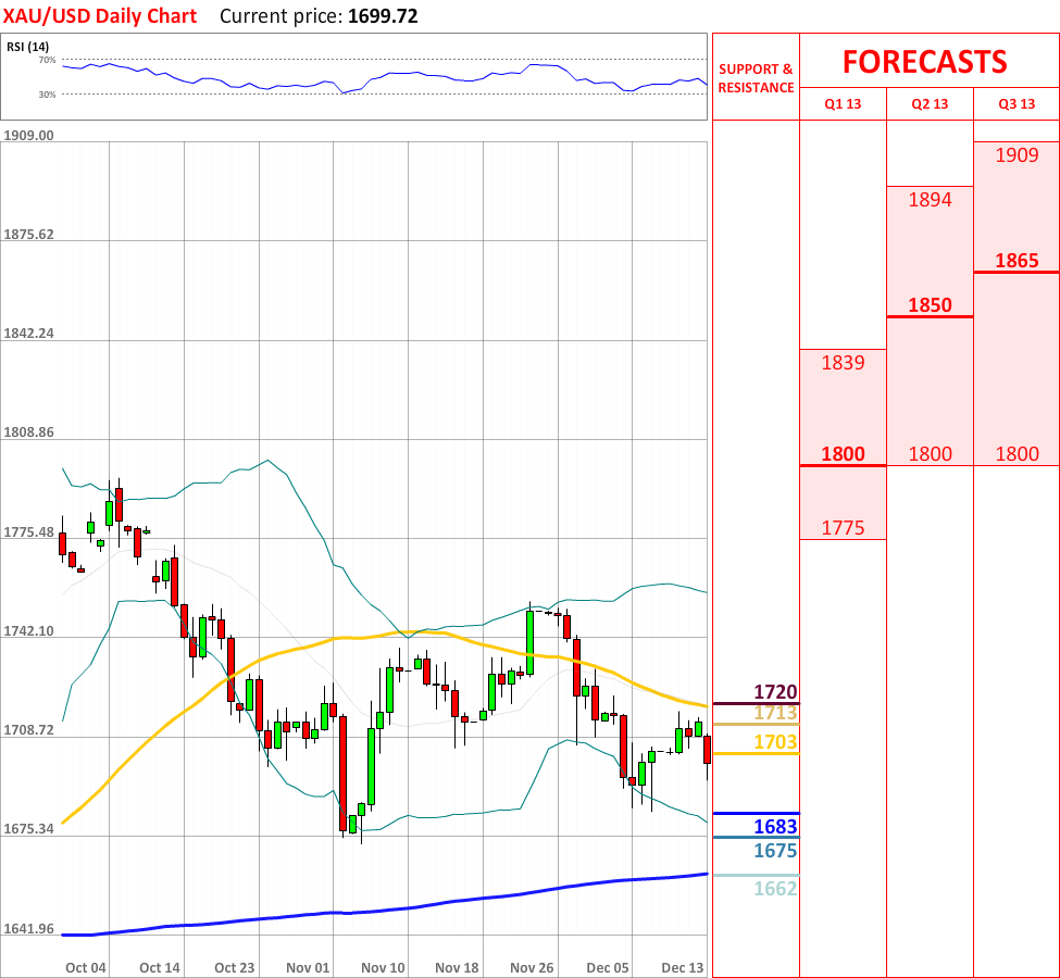 OutlookYesterday's bullish correction failed to continue, as today the XAU/USD exchange rate experienced a significant bearish reaction, which at the particular moment is gradually approaching the weekly S1 at 1683, which might bring some bullish impulse. In case it is breached, then the price might decline until the lower Bollinger band at 1675, which in turn will probably change the direction of the current bearish trend. Moreover, the overall indicator outlook is negative, therefore supporting the prevailing movement downwards.
