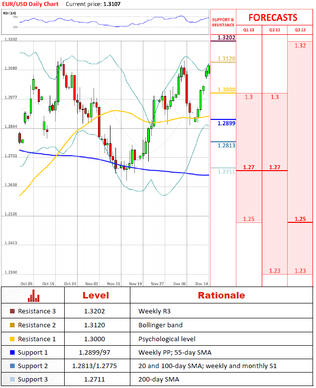 Today is a fifth consecutive trading session the major currency pair firmly steps higher. Despite the fact that yesterday EUR/USD was volatile on both sides, indicative of a weakening upside impulse, the price closed with a notable positive result. Currently the pair is rallying further and has already approached the key resistance area at 1.3120, where the upper Bollinger line intersects the monthly R1.