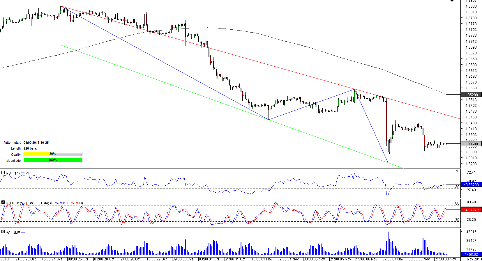 A jump to a two-year high in the end of October was a starting point of a steep channel down pattern. On November 7, the pair dropped to a two-month low amid a slew of positive data from the U.S. as well as the EBC unexpected decision to cut rates. However, this pressure ebbed and the pair recovered some of its losses. Currently, the currency couple is vacillating close to the four-hour pivot point at 1.3358, while the perspectives of the pair appear obscure, with market players being divided on the future moves of EUR/USD. 48.79% of traders bet on appreciation of the pair, whereas 51.21% of them expect a decline in the following hours.
