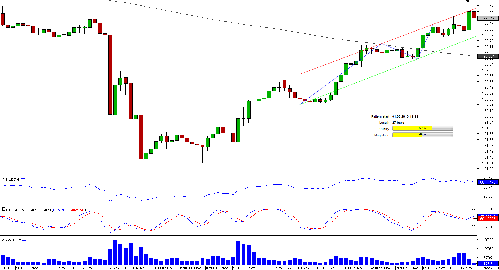 Just recently EUR/JPY has fully pared the losses made on Nov 7—it took the pair 60 hours. During this recovery the currency pair has been respecting two rising trend-lines that are now the boundaries of the channel up pattern. The upper edge is currently at 133.71 and the lower one is at 133.33.
