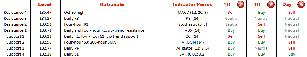 Considering the technical indicators on the hourly and four-hour charts, the singly European currency is likely to maintain its upward course. However, this pattern is unlikely to stay intact for long, being that it is narrow (40-50 pips wide) and the currency pair is approaching a formidable resistance level represented by the October 30 high at 135.47.