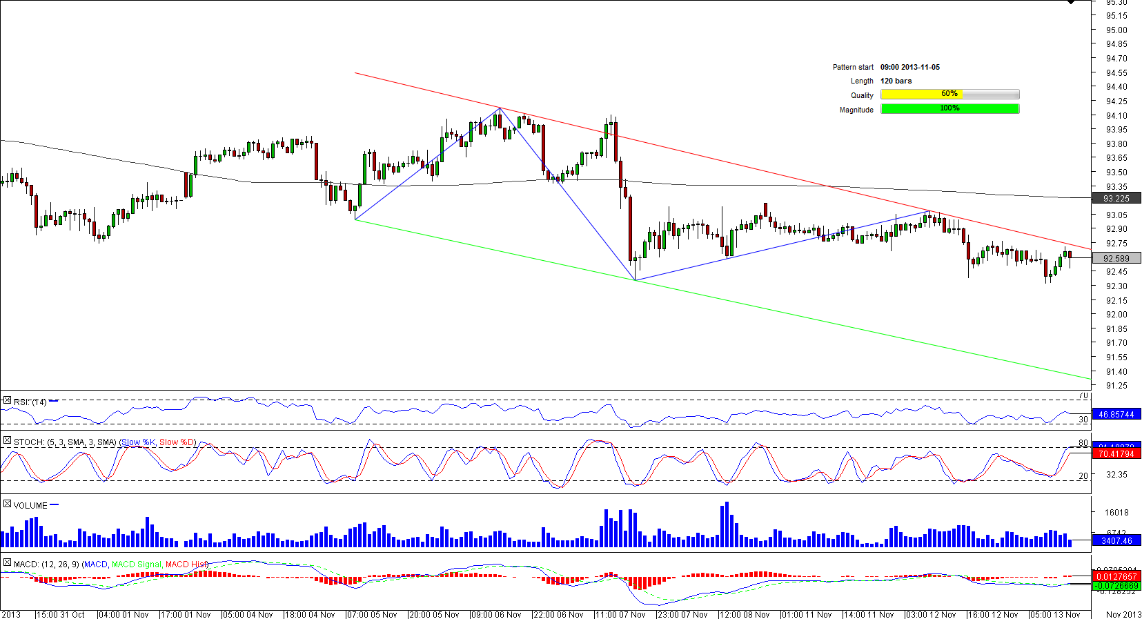 Even though the currency pair managed to lift above the 200-hour SMA at the beginning of November, which generally is a bullish sign, soon afterwards the Australian Dollar started to decline. Since then AUD/JPY has been trading beneath the falling resistance line that now may be considered an upper boundary of the bearish channel, although a lower edge of the pattern has been confirmed only on few occasions and therefore is still unreliable. In the meantime, while the hourly and four-hour technical indicators are giving ‘sell' signals, the distribution of open positions is heavily skewed towards the long ones—they constitute 73% of the total.