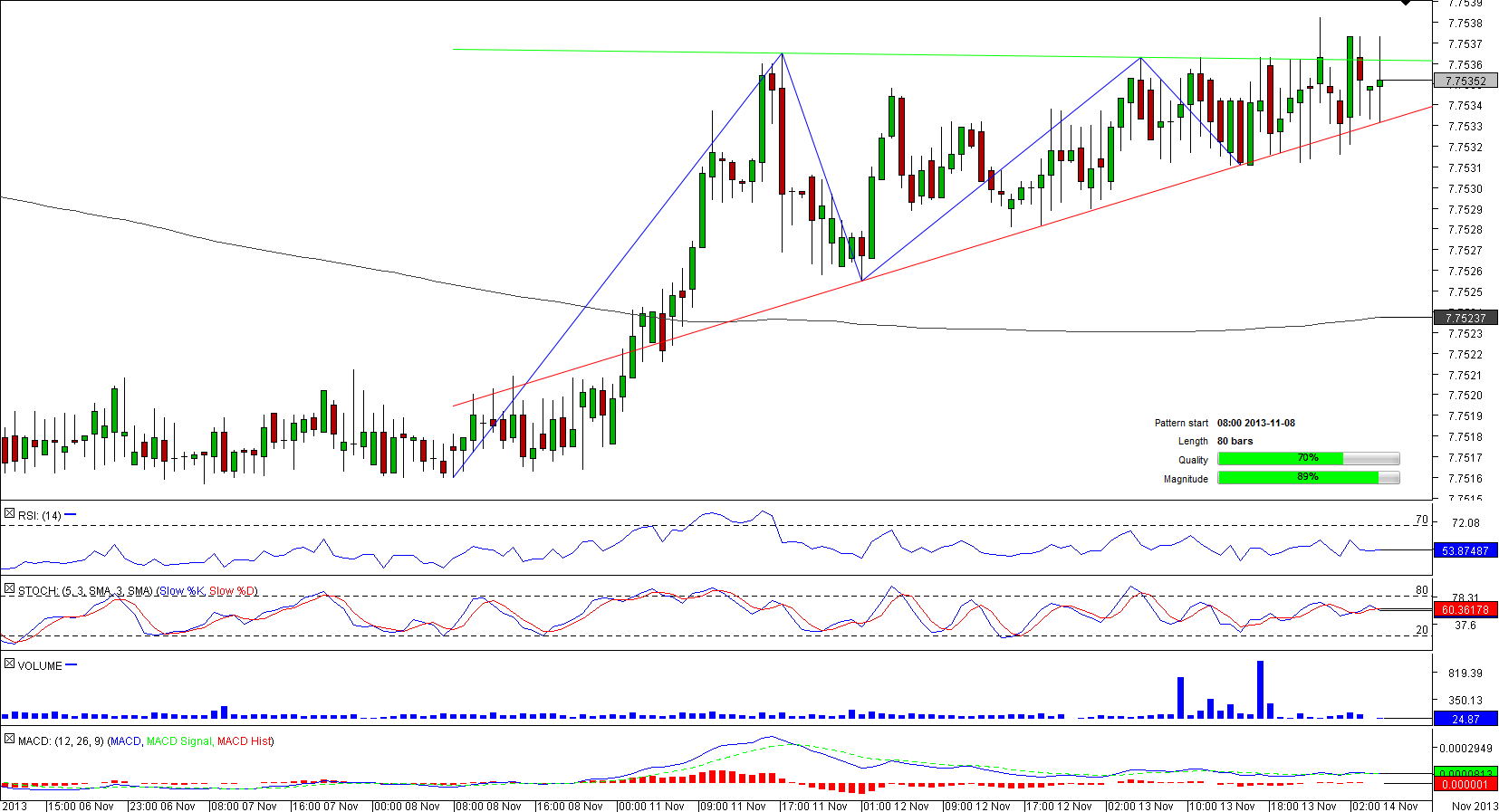 Having touched a one-year low, the U.S. Dollar got an impulse to advance against its Hong Kong peer. The appreciation started alongside with formation of the ascending triangle pattern on November 8. At the moment of writing, the pair was fluctuating close to the apex of the triangle that signals on the looming breakout. Ascending triangle patterns usually result in bullish breakout and this time is not likely to be an exception, with 66.67% of all orders being placed to buy the instrument. Technical indicators also suggest a climb in the short-term but are neutral for medium and long terms.