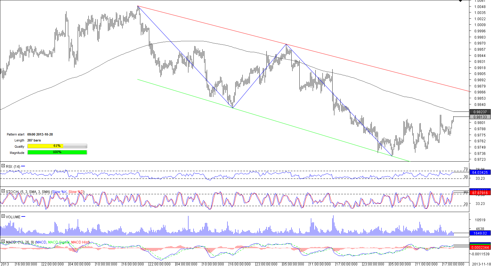 The Australian Dollar commenced a retreat against its Canadian counterpart after it reached a four-month high in the end of October. Since then, the pair has been declining, being trapped by two downward sloping lines. At the moment of writing, the AUD/CAD movements were also bounded by its SMAs; 50-hour SMA was preventing a further decline, whereas 200-hour SMA was blocking a climb. The SWFX data indicates that traders are divided on the pair's perspectives; 52% are bullish, while 48% are bearish on the pair.