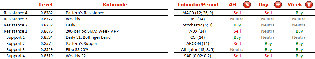 The Canadian Dollar acted almost like its American counterpart, as NZD/CAD cross fell more than 170 pips and even crossed a 200-period SMA, suggesting bears would dominate the market in the nearest future. Moreover, aggregate technical indicators on a 4H chart are sending "sell" signals, meaning a retest of support line can be expected. Nevertheless, in a mid-term we could see a period of consolidation, however, a move below 0.8529 is unlikely, as it is represented by a Fibonacci retracement as well as weekly support, which is located just 10 pips lower.
