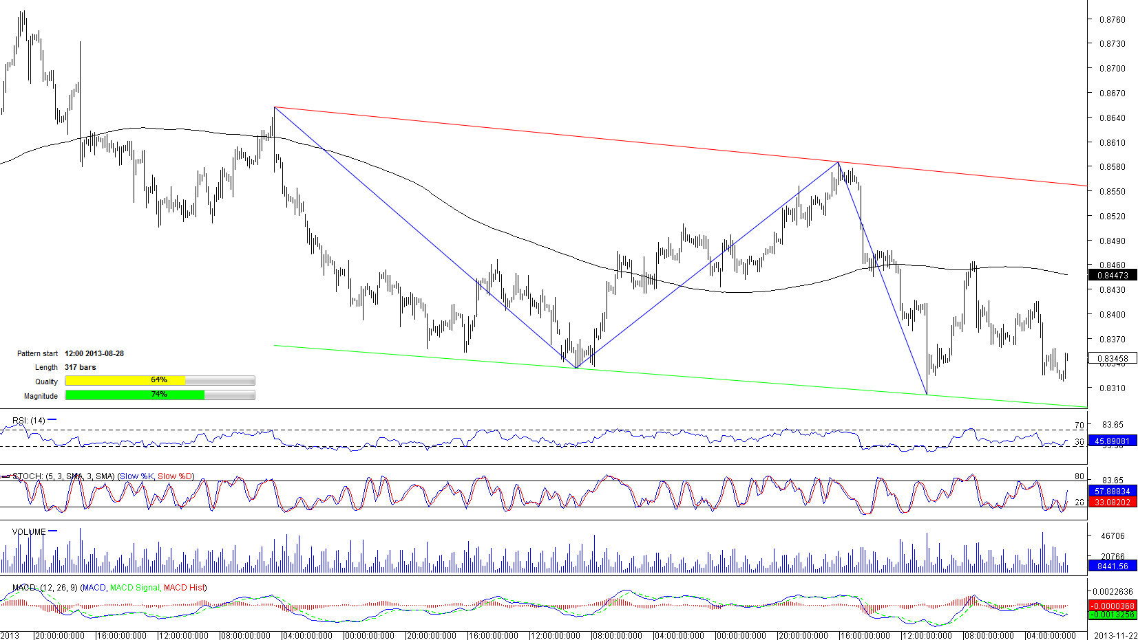 We continue to observe formation of the major pattern by EUR/GBP on the four-hour chart, namely of the bearish channel, which was started back in August and is already almost 360 bars long. Concerning the most recent events, it appears that the currency pair took a U-turn before reaching the major support area represented by the falling support line at 0.8288. The price bounced off the weekly S1 level at 0.8317 and is currently headed north, towards the local peak at 0.8412, although on the whole the technical indicators are giving ‘sell' signals at the moment. At the same time SWFX traders seem to be undecided—47% are long and 53% are short.