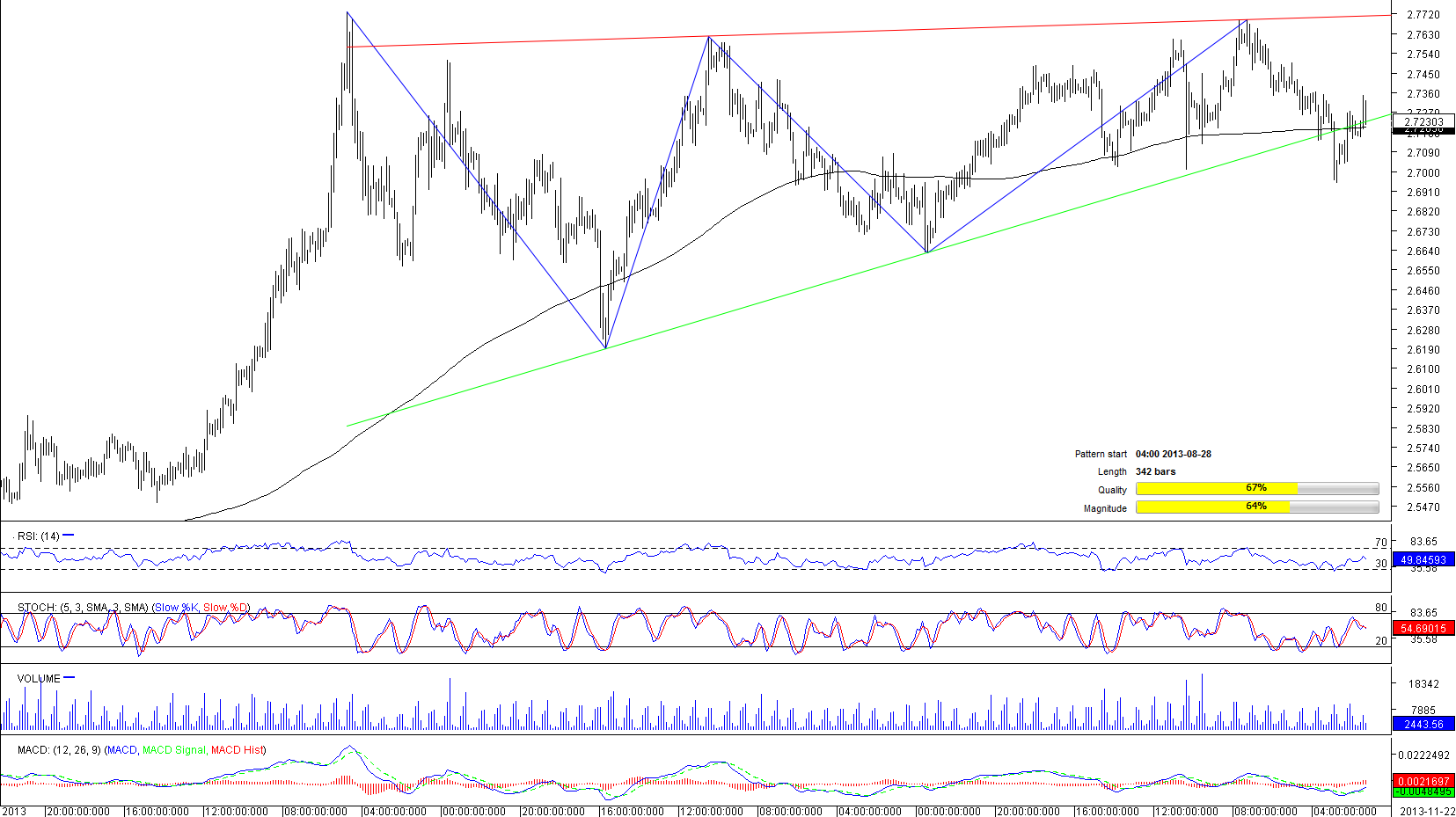 Judging by the price action during the last three months, EUR/TRY is currently trading within the boundaries of an ascending triangle: after making sharp gains (160 pips) in the second part of August, the currency pair encountered a tough resistance level at 2.7711 that denied all subsequent attempts of the Euro to resume the rally. In the meantime, the setbacks of the pair, which ensued as a result of assaults on 2.7711, were becoming less and less pronounced, thereby drawing the up-trend support line.