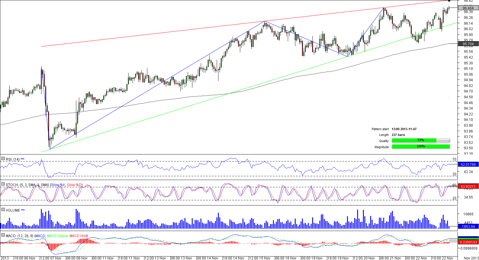 The Canadian Dollar has rallied against the Japanese Yen for 237 hours, forming a rising wedge pattern that started on November 17. The pair fell below the lower trend line of the pattern for two times; however, it managed to return to the pattern's boundaries both times. At the moment, the currency couple is vacillating close to the highest level since September 20 and may attempt to jump above this peak to meet the daily resistance sitting at the pattern's upper boundary at 96.53. If overcome, the pair may witness a breakout that may be real this time given that convergence point of the pattern lines is nearing.