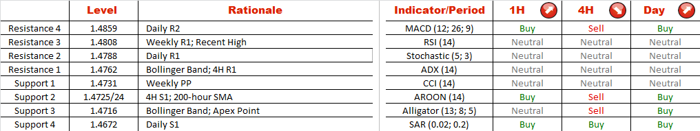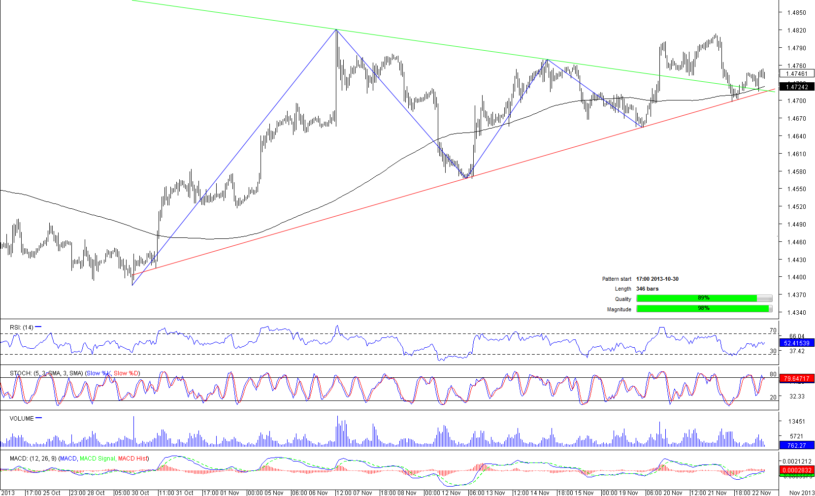 Though GBP/CHF is not trading in boundaries of a triangle pattern anymore, the pair is still representing great opportunities for traders. At the moment of writing the pair was hovering at 1.4749, just 33 points above the apex point. Despite the fact the price almost touched pattern's boundaries once again, the outlook remains strongly bullish. Aggregate indicators on a 1H and daily charts are sending "buy" signals, and the fact the price penetrated the 200-hour SMA from the upside is reflecting the strength of bullish trend. Nevertheless, 73% of traders are holding short positions, meaning in the short term a move toward 200-hour SMA or apex point is expected, while the outlook is still bullish.