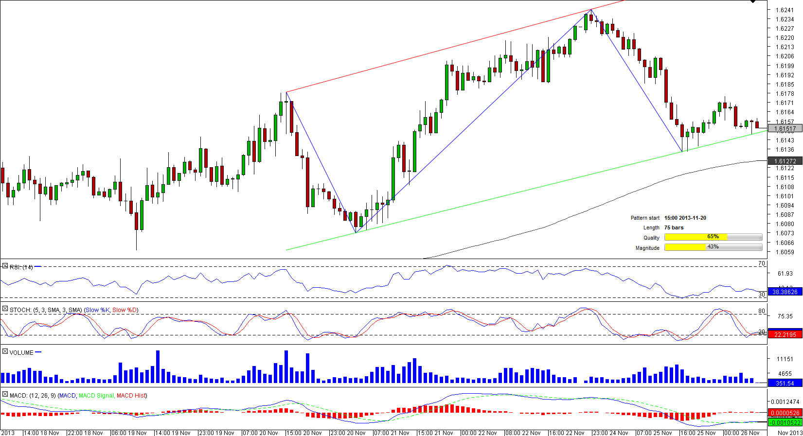 Although the British Pound followed a bullish trend against the U.S. Dollar shortly after it touched a two-month low in mid-November, a formation of the channel up pattern started only on November 20. At the moment of writing, the currency couple vacillated close to the pattern's support at 1.6149 but traders were not expecting a breakout, being bullish in 57.96% of cases. If the pair bounces off the pattern's lower boundary, it will target four-hour pivot point and resistance at 1.6159/68 and if buying pressure does not abate the pair may try to penetrate the daily pivot point at 1.6181.