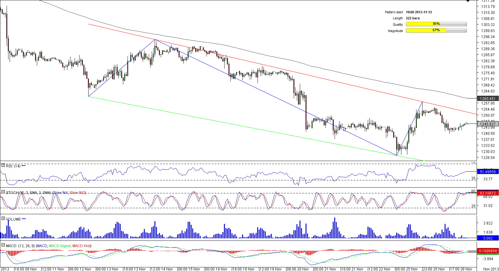 Although the yellow metal has been retreating since the end of October, a formation of the channel down pattern started only in mid-November. Recently, XAU/USD has touched a three-month low of 1,227.27, the level which was low enough to give the pair an impetus for appreciation. Currently, gold is trading slightly above its 50-hour SMA and is expected to extend its rally as 54.86% of traders are bullish on the precious metal. Meanwhile, technical indicators are neutral for short and medium terms but are sending strong bearish signals for the long-term.