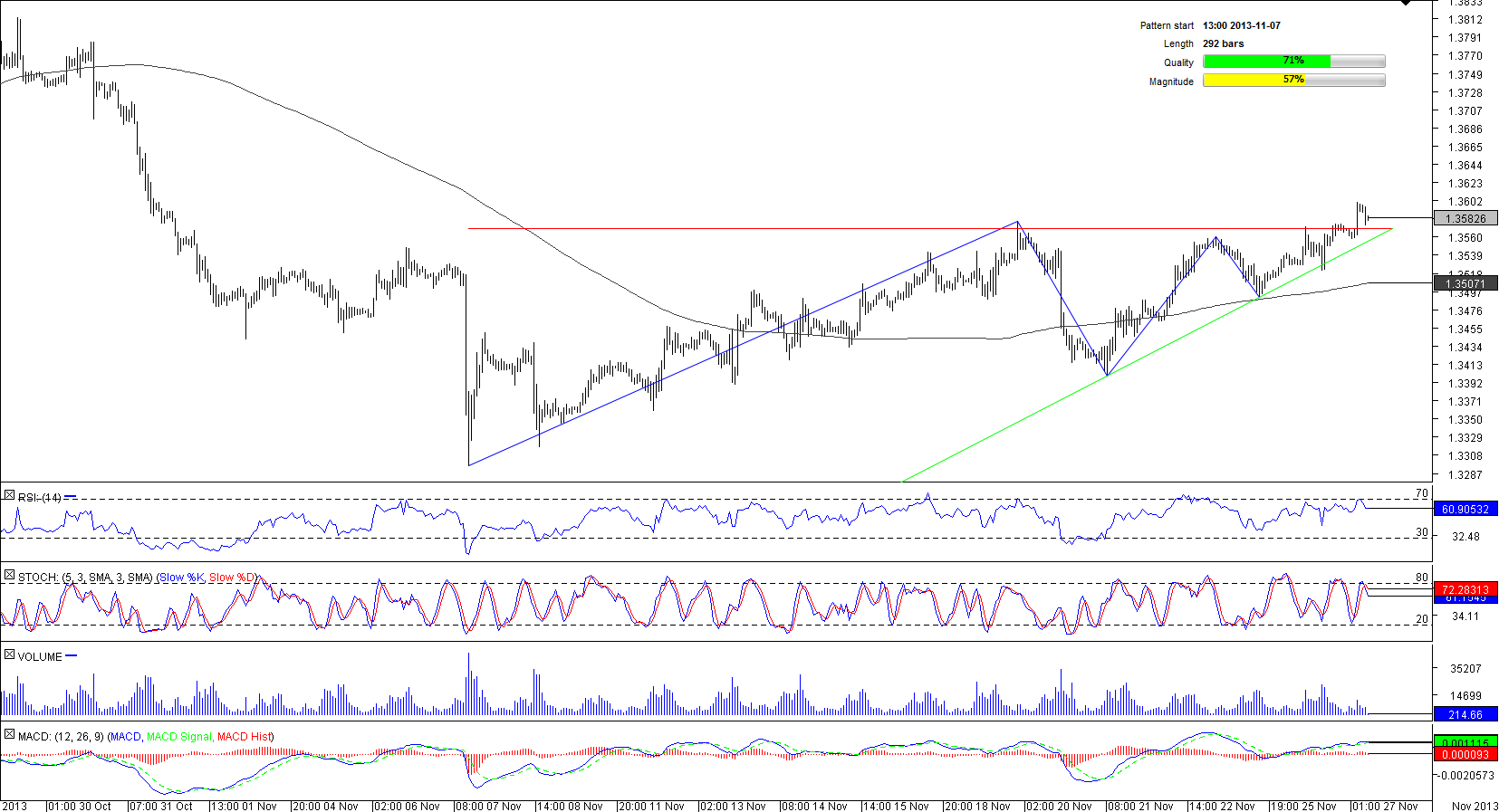 A decline to almost a two-month low in the beginning of November was a starting point of the ascending triangle pattern formed by the most traded currency pair. At the moment of writing, the EUR/USD seemed to have breached the upper limit of the pattern; the breakout occurred very close to the triangle apex. Despite jumping above the upper boundary of the pattern, the pair does not show willingness to appreciate sharply, contradicting to the general tendency of the breakout from an ascending triangle pattern.