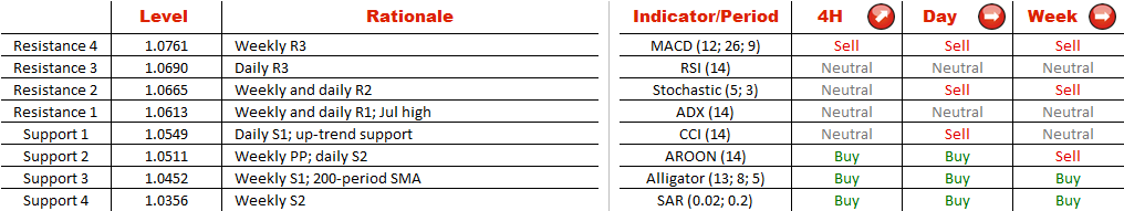 Now, considering that the exchange rate has reached the formidable resistance level represented by the Jul high, the currency pair is expected to break out of the pattern by violating the support at 1.0549 in the nearest future. Then the first target for the price will be the weekly PP level at 1.0511, thought the sell-off is likely to last until the next support at 1.0452 (weekly S1 and 200-period SMA) is attained.