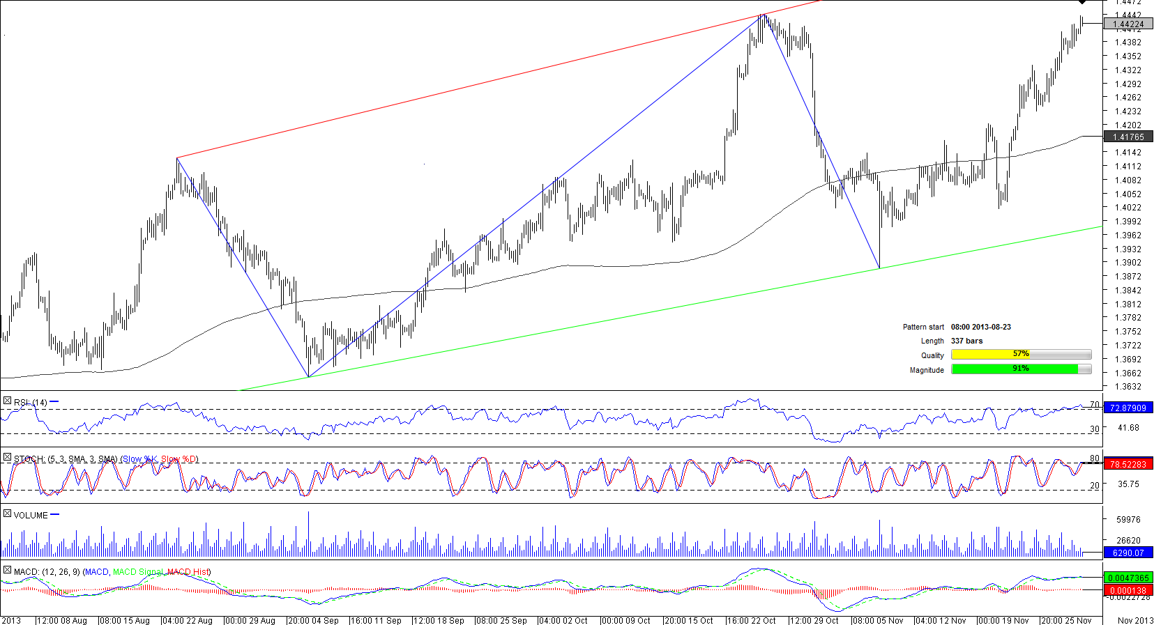 A 337-bar long channel up pattern formed by EUR/CAD started on August 23. The pattern is more than 600-pips wide thus allowing the pair to perform large fluctuations within its territory. Recently, the currency couple has hit more than a five-year high of 1.4441 for the second time during the month; currently EUR/CAD is trading below this peak, albeit slightly. Market players are optimistic about the pair's prospects, being bullish in 75% of cases; in other words, traders expect the pair to overcome the five-year high that represents a formidable resistance that prevents a climb to the pattern's resistance.