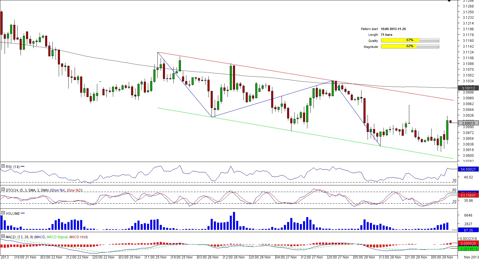 During this week USD/PLN has been exhibiting propensity to decline, being pressured by the long-term moving average from above. As a result, the currency pair formed a bearish channel, which is now more than 200 bars in length.