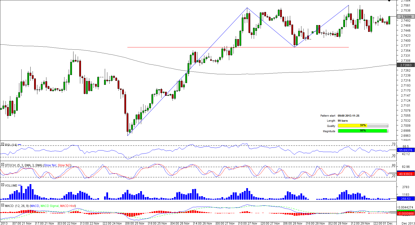 EUR/TRY started to form a double top pattern on November 25, when the Euro hit a five-day low versus the Turkish Lira. After that, the pair was climbing until it reached a two-week high that is the highest point of the pattern; this level was reached for two times, with the second peak being slightly higher that the first. After the second stab to this high, the currency couple was supposed to follow a bearish trend; however, its 50-hour SMA is preventing the decline.