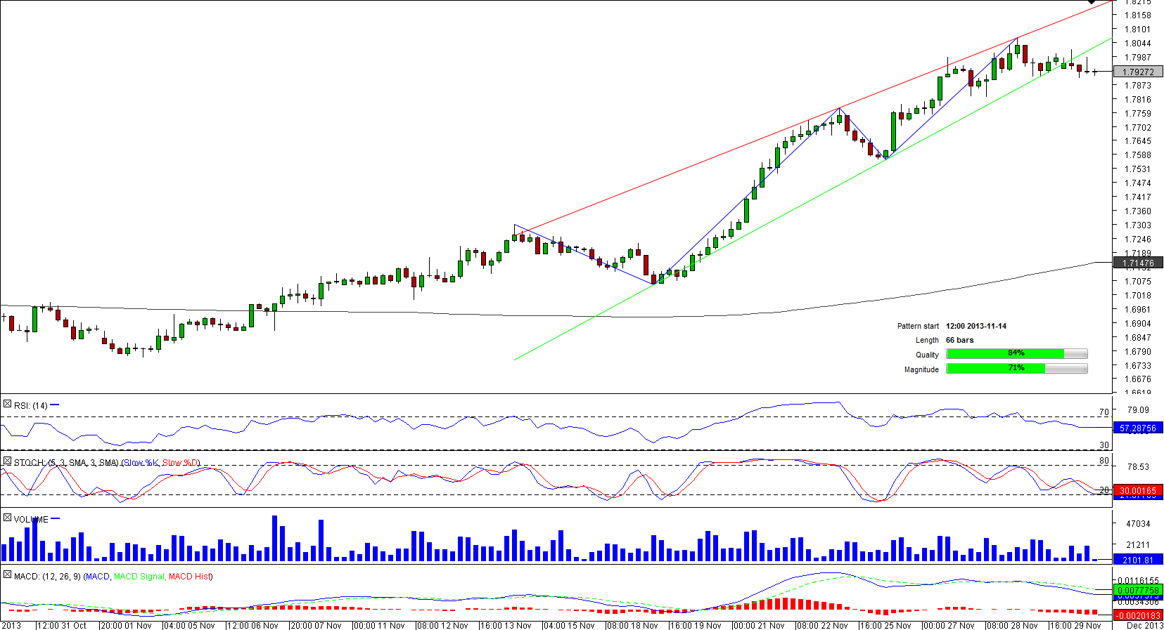 GBP/AUD has been in a strong up-trend since Nov 19 and covered more than 10 figures during this time period. However, at the same time the trading range of the pair was gradually narrowing, leading to formation of the reversal pattern on the four-hour chart. Just recently the price has encountered a tough resistance at 1.8158, an event that resulted in a break-out to the downside. Still, the Great British Pound does not seem to be in a hurry to depreciate regardless of the fact that the up-trend support line has been breached. If none of the nearest pivots are able to stop the decline, eventually the rate is likely to descend down to the 200-period SMA at 1.7167.