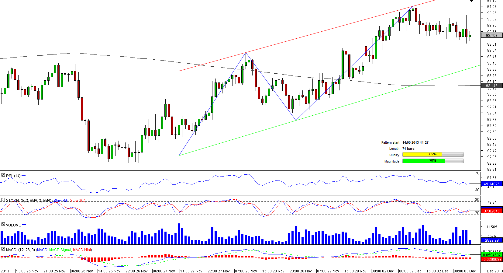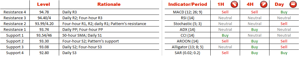 AUD/JPY has been vacillating between two upward sloping lines for the last 71 hour and is likely to prolong its trend in the foreseeable future. Market sentiment is strongly bullish, with 82.54% of traders betting on the appreciation of the pair. Meanwhile, technical indicators neither bolster nor gainsay the bullish outlook, sending mixed signals. To meet the traders' expectations, the currency couple has to test the four-hour resistance at 93.99 and then target the daily resistance at 94.12 where the pair may halt the rally given strong selling pressure that may start to push the pair lower not to allow AUD/JPY to surpass the pattern's resistance.