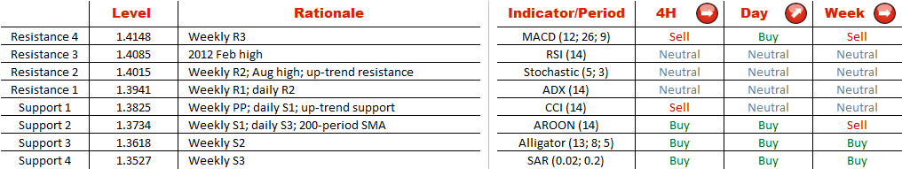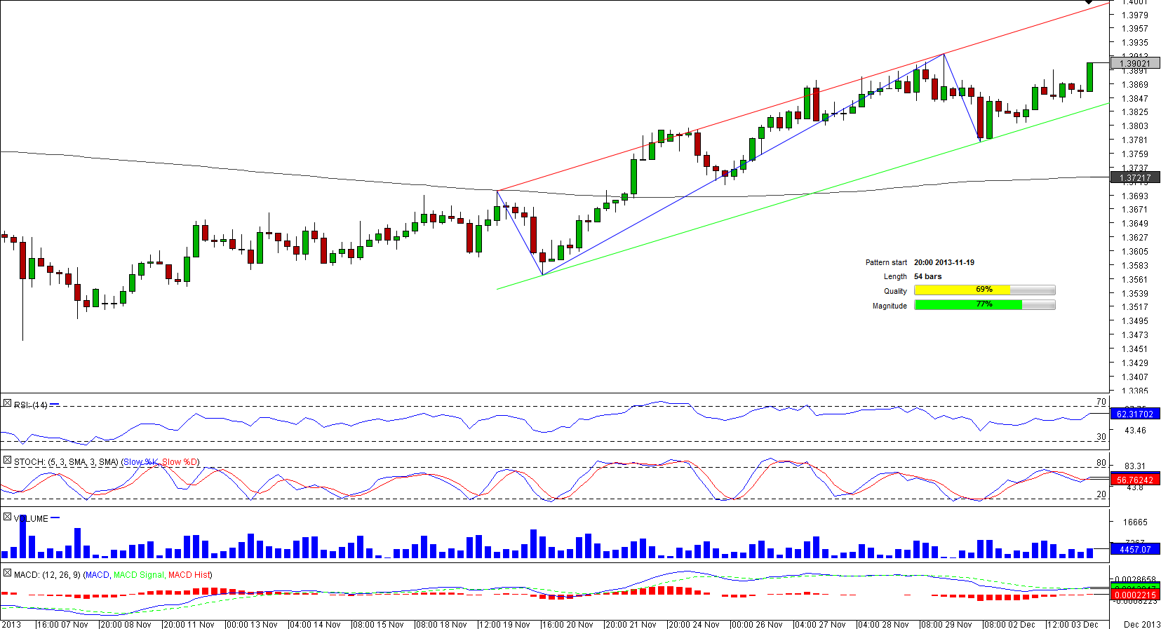 The bullish channel currently being formed on the four-hour chart is a part of the rally that began to develop on Nov 7. Right now the rate is moving away from the lower edge of the formation at 1.3825, which was also reinforced by the weekly pivot point.