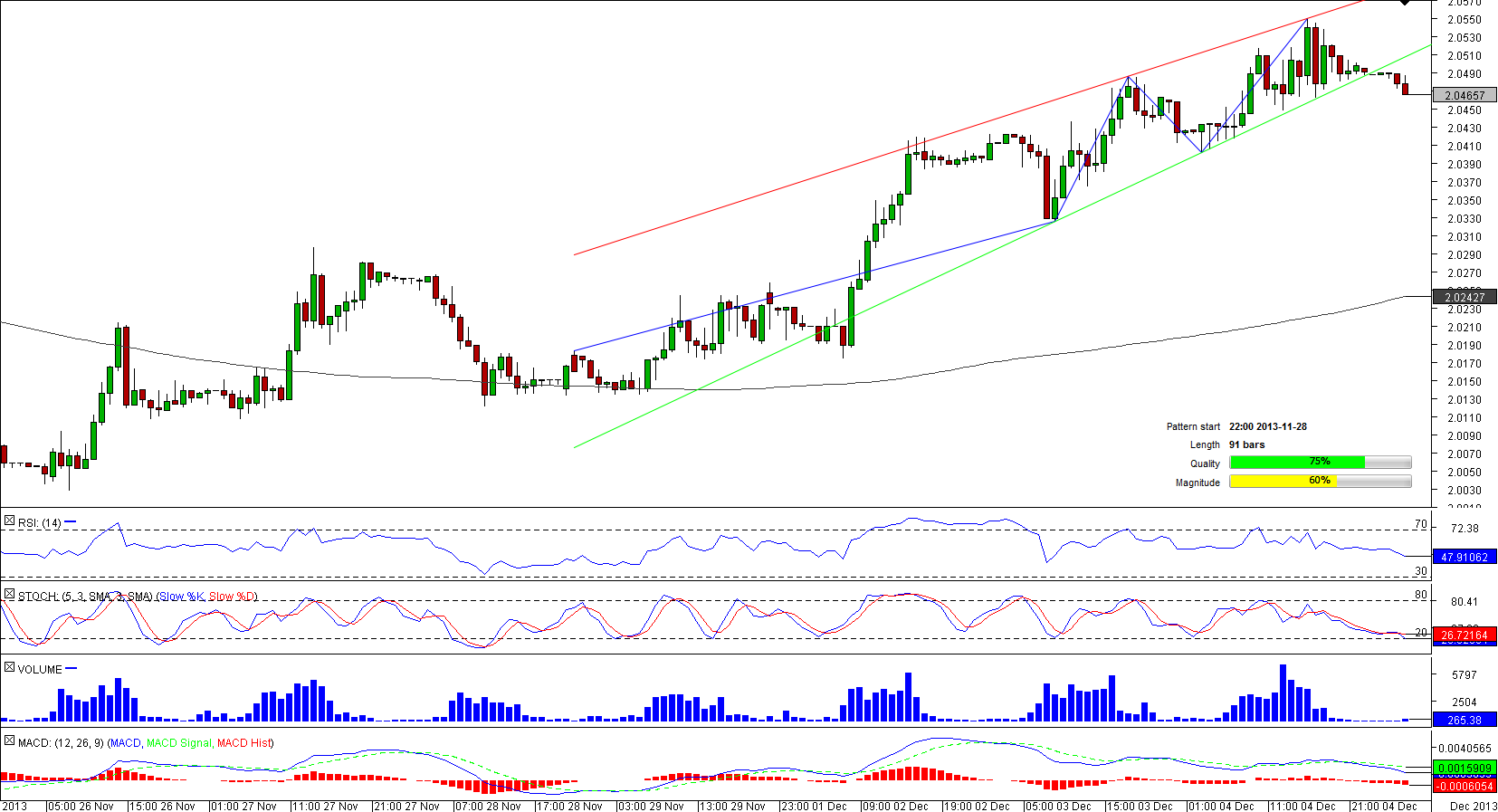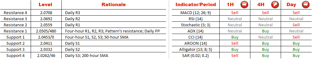 A stab to a one-month low in mid-November incited an advance of the U.S. Dollar versus the Turkish Lira that led to a formation of the rising wedge pattern on November 28. After fluctuating within the pattern boundaries during almost 90 hours, the pair breached the lower limit that is an indication that the breakout may have occurred. However, a sharp decline that usually follows such breakout may be held back by the 50-hour SMA that is sitting at 2.0450 and is not likely to let the pair to reach the daily support at 2.0411 in the hours to come.