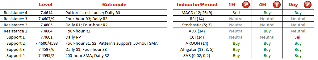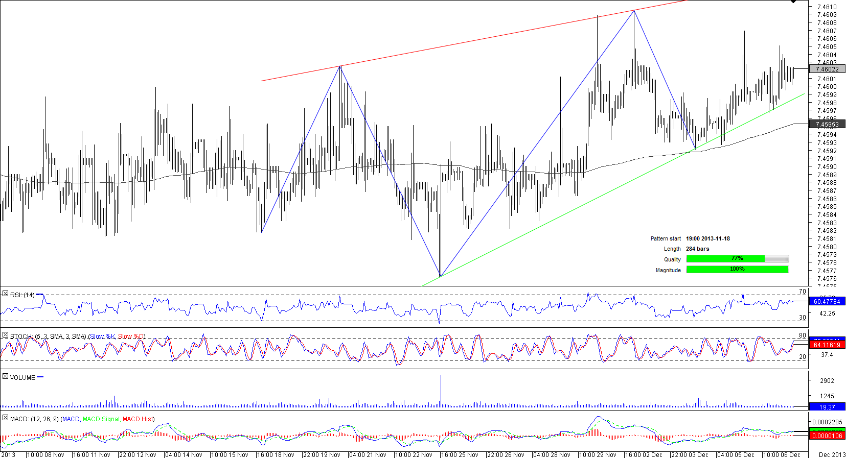 A 284-bar long rising wedge pattern shaped by EUR/DKK was started on November 18. Being trapped by two gradually converging lines, the currency pair was unable to perform large fluctuations and was vacillating near its short- and long-term SMAs. Currently, the pair is trading above both SMAs, albeit slightly; the 50-hour SMA is sticking to the pattern's support and coupled with the 200-hour SMA acts as a strong support level sitting at 7.4599/5. Meanwhile, market players are mostly bullish on the EUR/DKK; 60% of all orders are placed to buy the pair, according to the SWFX data.
