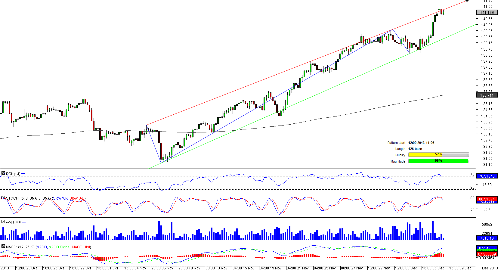 EUR/JPY was trading sideways during eight months ended November 6 when the pair commenced an appreciation that allowed the EUR/JPY to shape a narrow channel up pattern. At the moment of writing, the currency pair was faltering close to the upper limit of the pattern and may breach this resistance given that 68.25% of market players are bullish on the pair. Furthermore, technical indicators are sending bullish signals for short and medium-term, adding to signs that the bullish breakout may appear before long.