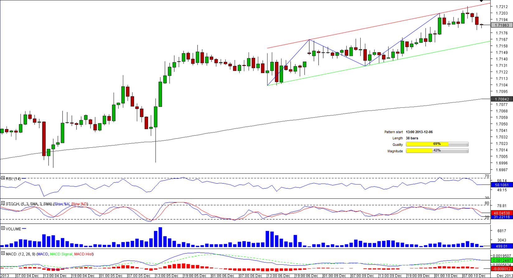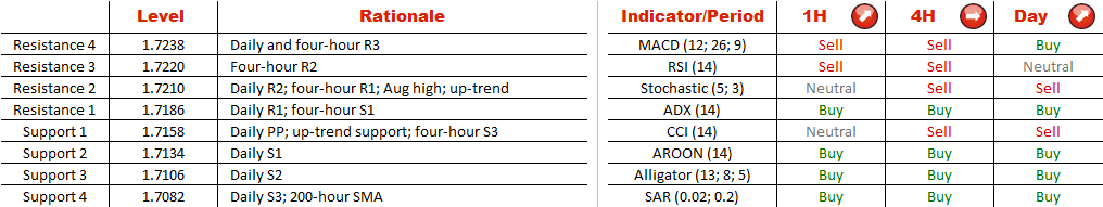 The past two days EUR/USD has been trading in a narrow range, being contained by two rising trend-lines that are 50 pips away from each other. The upper border of this pattern implies strong resistance at 1.7210, especially considering that it is reinforced by the August high. In the meantime, the lower boundary should not let the price fall beneath 1.7158, the level of the daily pivot point as well.