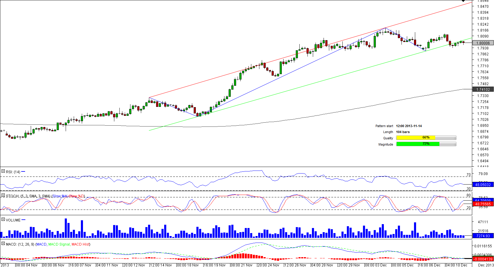 Being underpinned by the support at 97 the currency pair managed to start a strong recovery at the end of October. The rally, however, was bound by two rising trend-lines, meaning there is a bullish channel currently emerging on the four-hour chart. Still, the market is yet to confirm reliability of the lower boundary of the pattern, which was respected