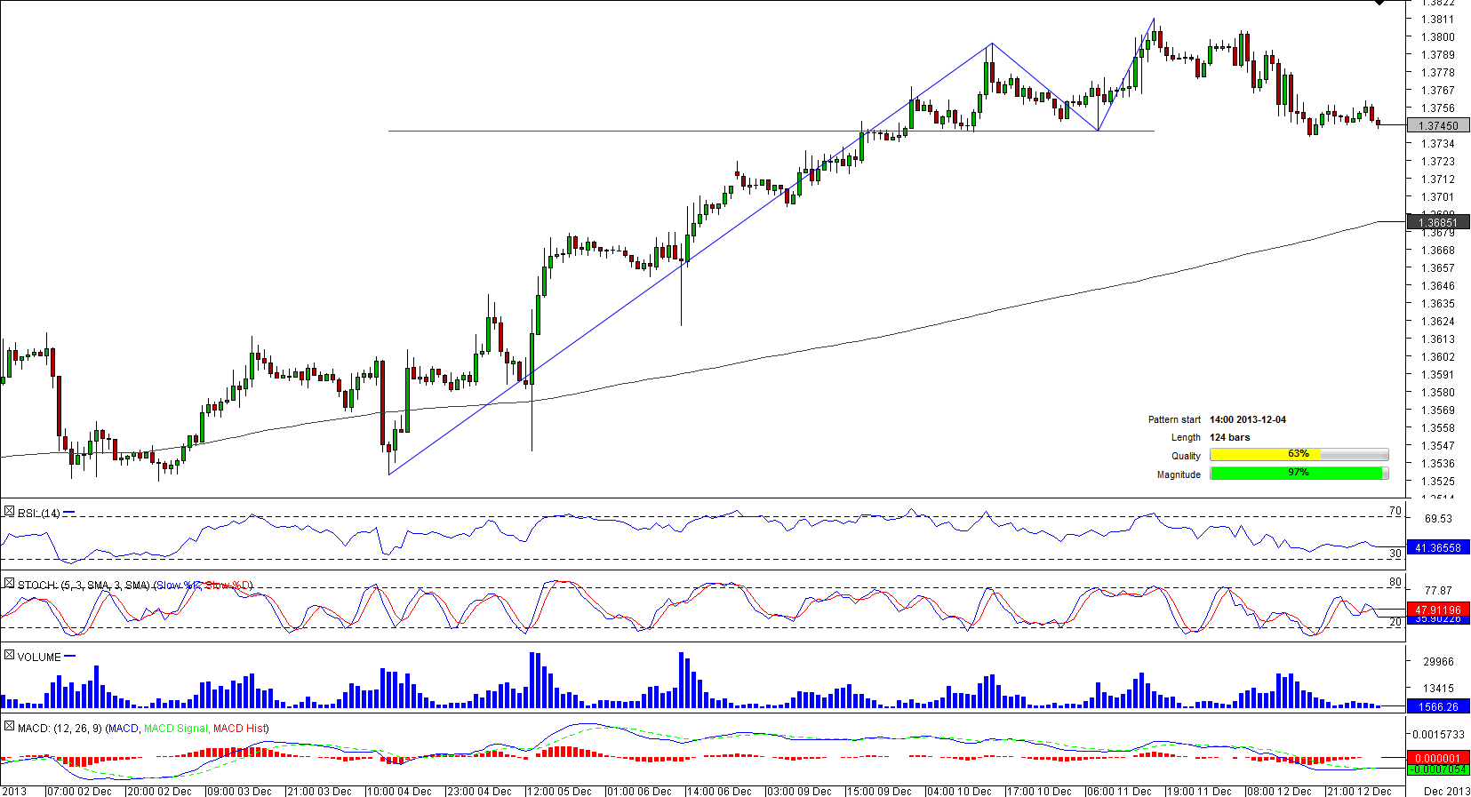 The most traded currency couple started to form a double top pattern on December 4 when it suddenly tumbled below its short-and long-term SMAs. Now the pair is struggling at the pattern's support at 1.3747 that is preventing a sharp decline usually observable when a currency pair breaches support of the double top pattern. EUR/USD approached this significant level after it retreated from the second peak of the pattern at a two-month high. Market players are moderately bearish on the pair, 54.57% of them bet on depreciation of the instrument, suggesting that a drop under the pattern's support line may occur before long.