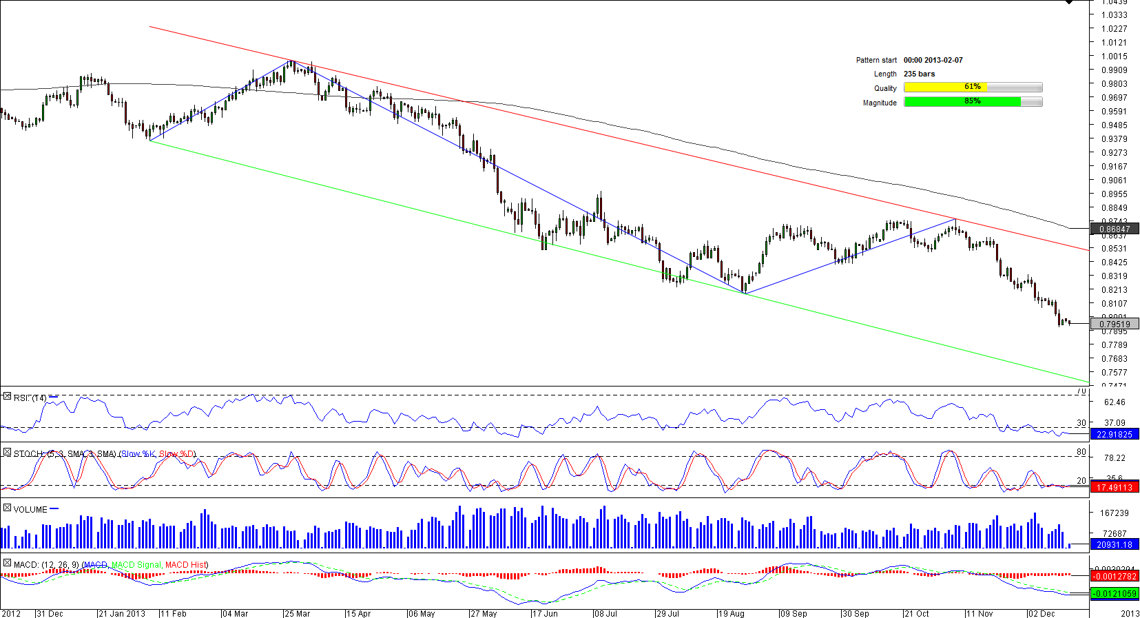 Soon after confirmation of the 200-period SMA as the new support in early November, HKD/JPY started to ascend within the boundaries of the upward-sloping corridor. However, the rate of price's growth has noticeably decreased lately. Accordingly, at the moment the currency pair is trading right at the lower rising trend-line that should be able to prevent extension of the dip