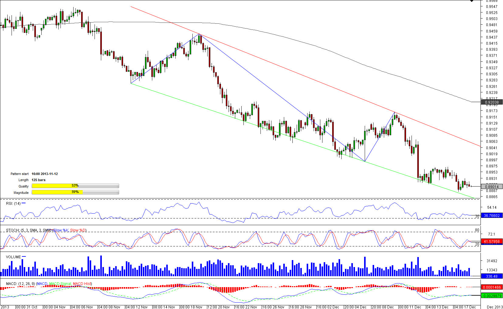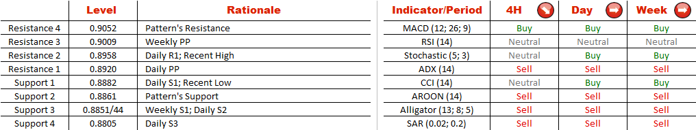 The Aussie is considered to be at an "uncomfortably high" level by the RBA even despite strong downside move that started in October. The pair is however, approaching a strong support at 0.89 and bears will need a strong fundamental and technical support to penetrate this level. Nonetheless, technical indicators on a 4H chart are pointing at a move below the key level, while strongly bullish (73.30%) market sentiment is pointing at a move in the opposite direction. While the outlook is unclear, 64.50% of all pending orders on the pair are placed to sell the Aussie against the buck. Hence, a move to the north will be limited, while downside movement will get additional support.