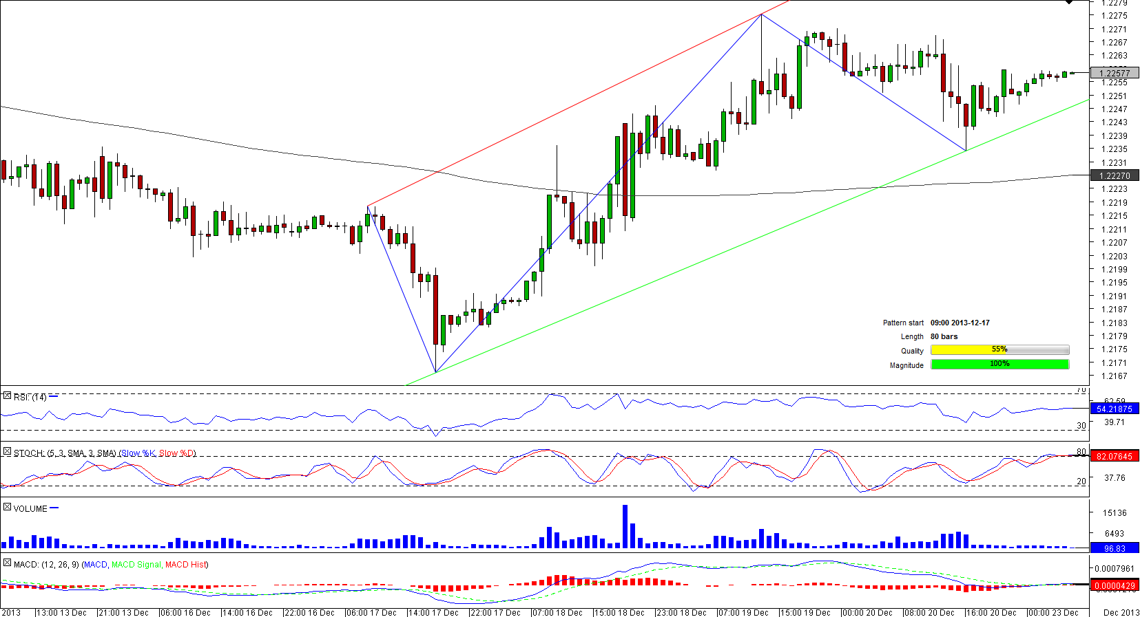 A dive to an eight-month low in mid-December incited an accelerating climb of the single currency against the Swiss Franc that led to a formation of the channel up pattern. The pair has vacillated in the corridor for 80 hours and may remain bounded by two upward sloping lines in the foreseeable future as even a moderate bearishness on the market is not likely to suggest a breakout. About 63% of traders are bearish on the pair but the 50-hour SMA sitting right below the current level of the pair is likely to contain any downswing.