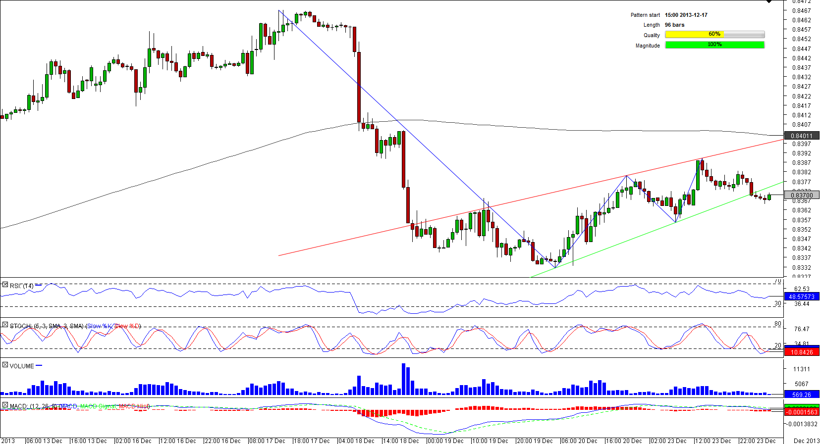 After plunging by more than 100 pips for less than one day time, the downside pressure abated and the Euro managed to rebound against the British Pound. The recovery was developed within the boundaries of the rising wedge pattern started on December 17.